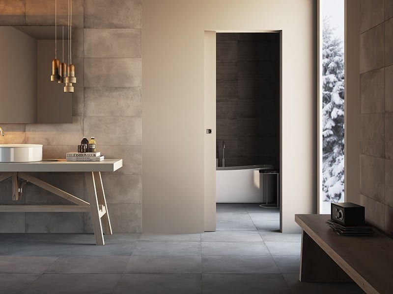 This is a private, intimate space, so the bathroom door will have to reflect these qualities. Ideally, from an aesthetic point of view, a bathroom door should be essential and discrete in its design. No one wants to attract one’s guests’ attention when using this room. Thus, you will want to choose a sober door with minimal lines. You can even opt for total mimesis with the wall, choosing a flush-to-the-wall hinged door. A finish matching the wall will make for near invisibility.